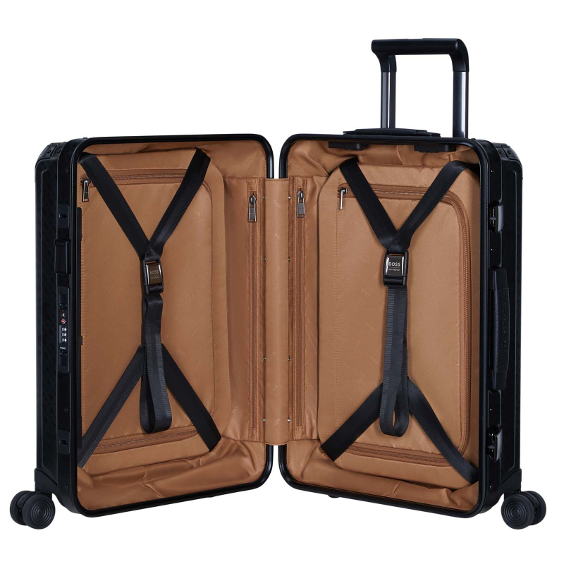 With the BOSS x Samsonite Lite-box spinner, glide effortlessly through your journeys with double wheels with ball bearings and a elongated double tube pull handle, ensuring seamless maneuverability and unparalleled comfort. The integration of TSA locks and a personalized tag provides peace of mind and a touch of individuality. Inside, the spacious interior is thoughtfully designed with packing straps, removable divider pads with pockets, all featuring soft-touch, high-quality lining, making the BOSS x Lite-Box Alu™ the epitome of functional luxury.