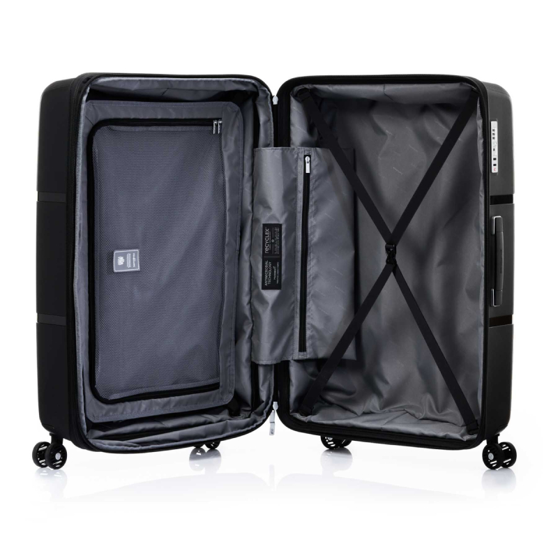 Interlace is equipped with double wheels allow you to move around with ease, TSA-approved combination lock, anti-theft security zipper to ensure that your belongings remain secure at all times. It also features a removable interior lining with Microban-treated Recycled PET lining is a foreground of our commitment to sustainability efforts. Interlace can be expanded for all sizes, making it a truly functional and stylish piece.